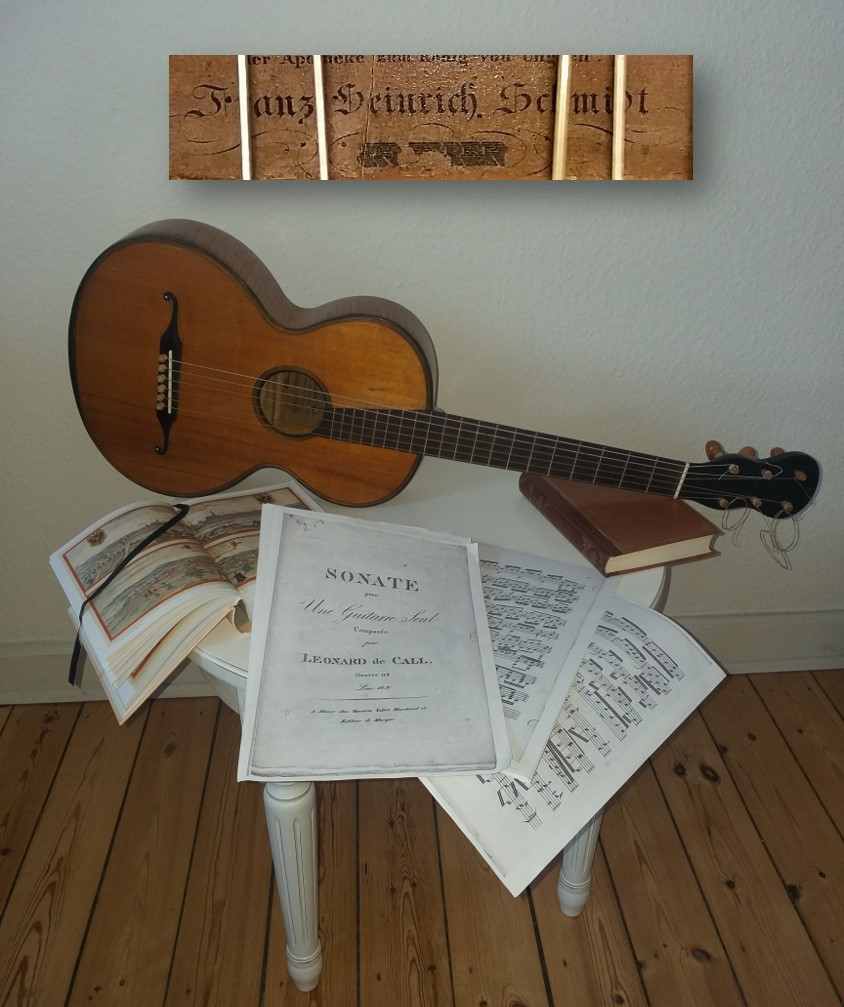 Franz Heinrich Schmidt was not a luthier but a musical instruments seller, who worked as manager of an important shop in Rothenthumstraße in Vienna (AT). Schmidt covered the Viennese demand of guitars by importing instruments from Bohemia and Moravia, from the Vogtlandkreis in Saxony and from Budapest. Although structurally attributable to the Germanic area, the exact origin of this ‘Terz-Gitarre’ is uncertain, except that it crossed the streets of the Austrian capital during the riots of 1848, a period in which Schmidt was fully active in Vienna.